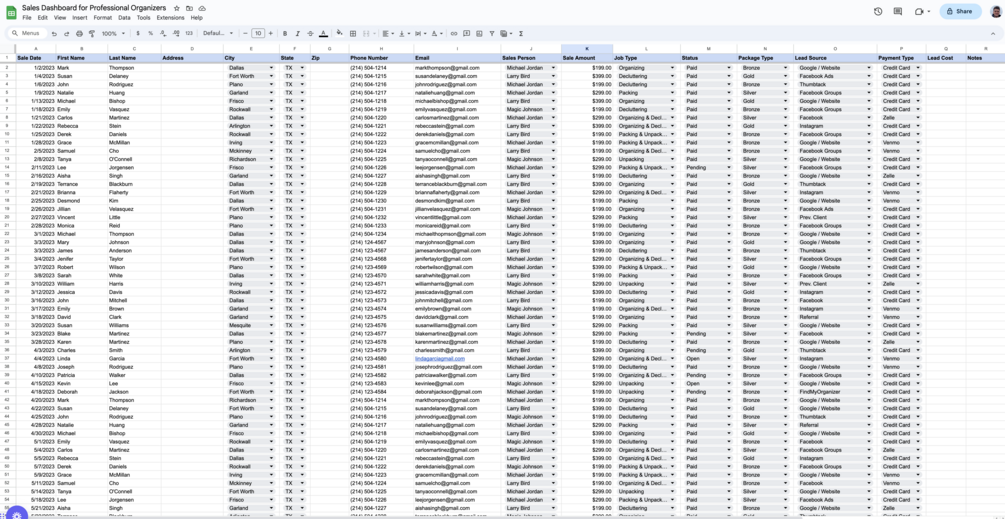 This is the exact sales dashboard we used in our organizing business to help track and monitor our organizing and decluttering sales without paying for a tool that requires a monthly commitment.